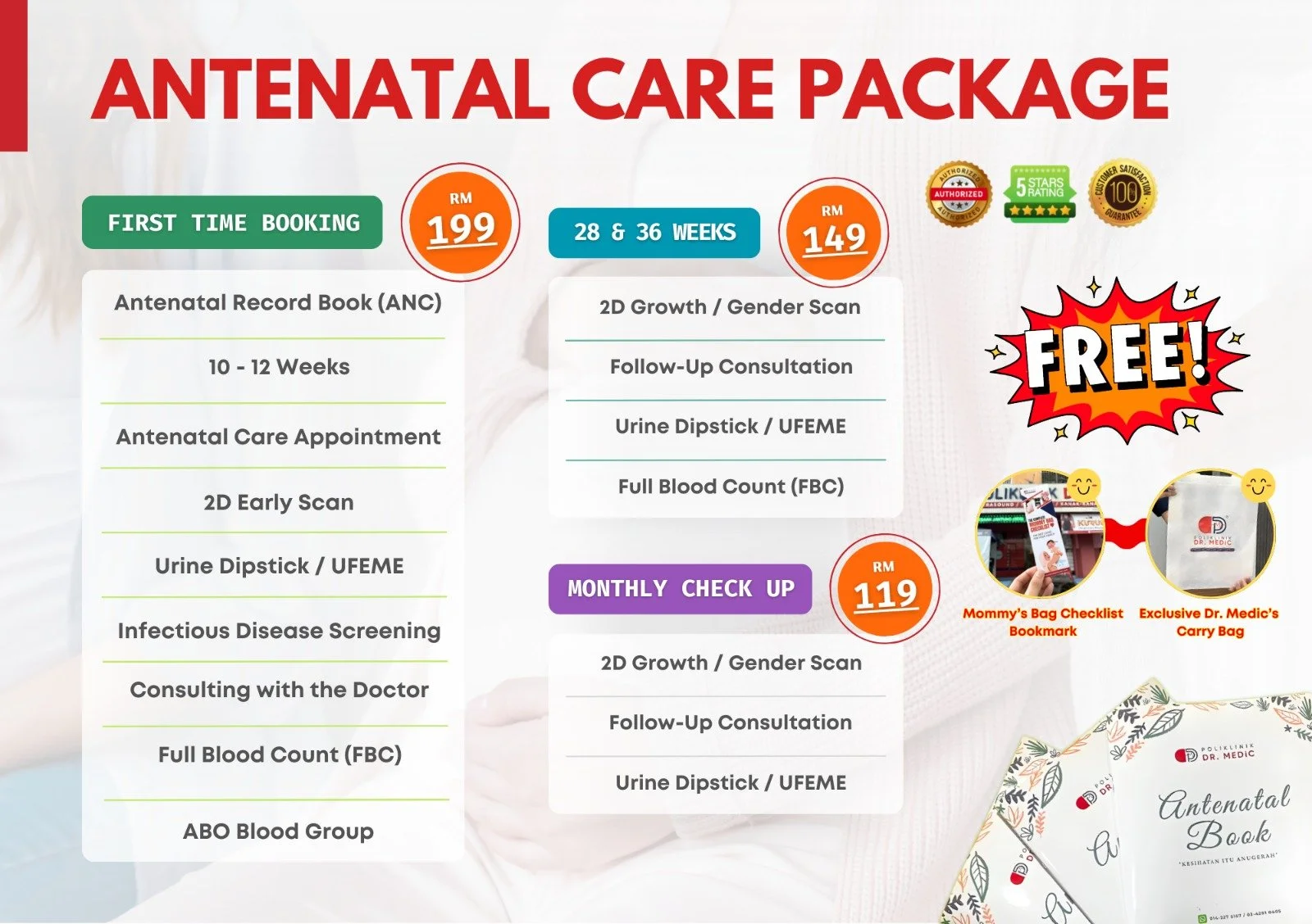 Menyediakan pemantauan kesihatan ibu sepanjang kehamilan termasuk nasihat pemakanan, rawatan komplikasi, dan pemeriksaan berkala untuk perkembangan bayi, serta rawatan selepas kelahiran untuk anak seperti imunisasi dan pemeriksaan perkembangan.
