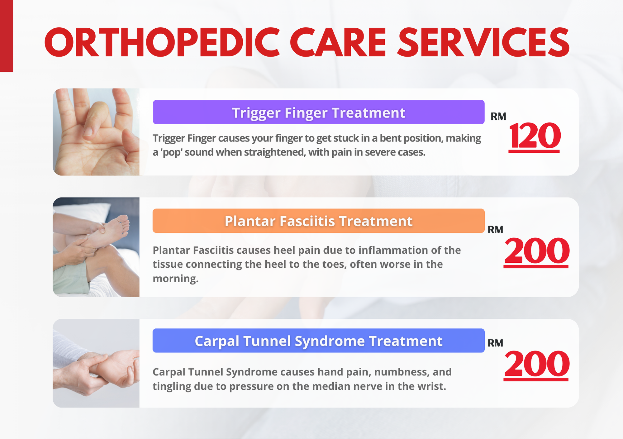 Pendekatan kami fokus pada rawatan konservatif untuk mengurangkan kesakitan dan memulihkan fungsi pergerakan, bergantung kepada kesesuaian pelanggan.